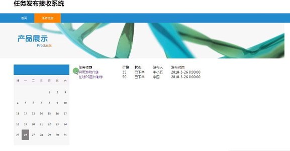 任務信息:以列表的形式展示了網站發布的任務信息,會顯示任務名稱,發布 日期,價格以及下單的狀態等,用戶在登錄后,能夠選擇在線接該任務或者選擇收藏任務,等后期進行在線接任務。